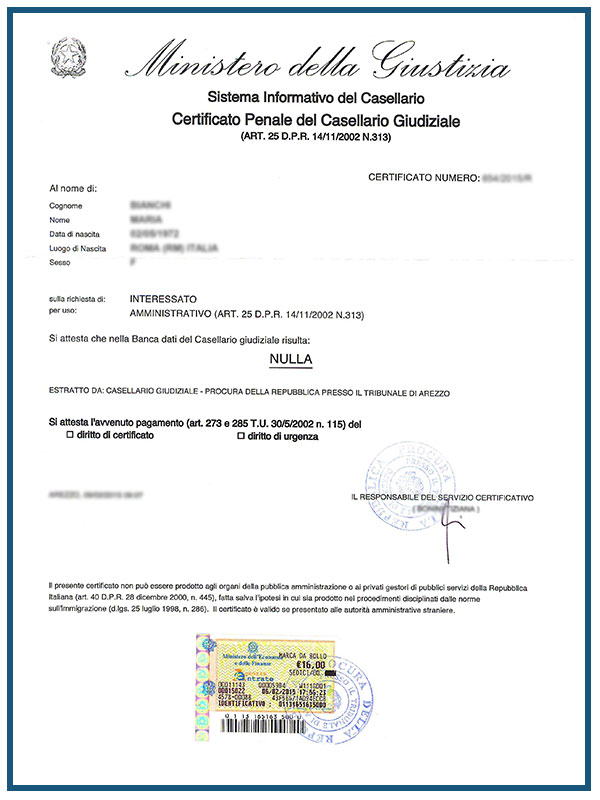Traduzione giurata del certificato del casellario giudiziale per uso presso ambasciate, consolati, autorità giudiziarie estere e datori di lavoro internazionali. Richiesta per pratiche di visto, immigrazione, assunzioni qualificate e autorizzazioni professionali all’estero.