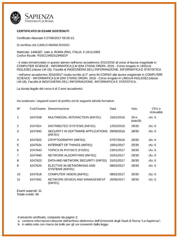 Traduzione certificata del certificato degli esami sostenuti per uso presso università estere, ordini professionali e datori di lavoro internazionali. Necessaria per l’iscrizione a corsi di laurea magistrale, master e programmi di specializzazione all’estero, e per il riconoscimento dei crediti formativi di studenti stranieri che si iscrivono a università italiane.