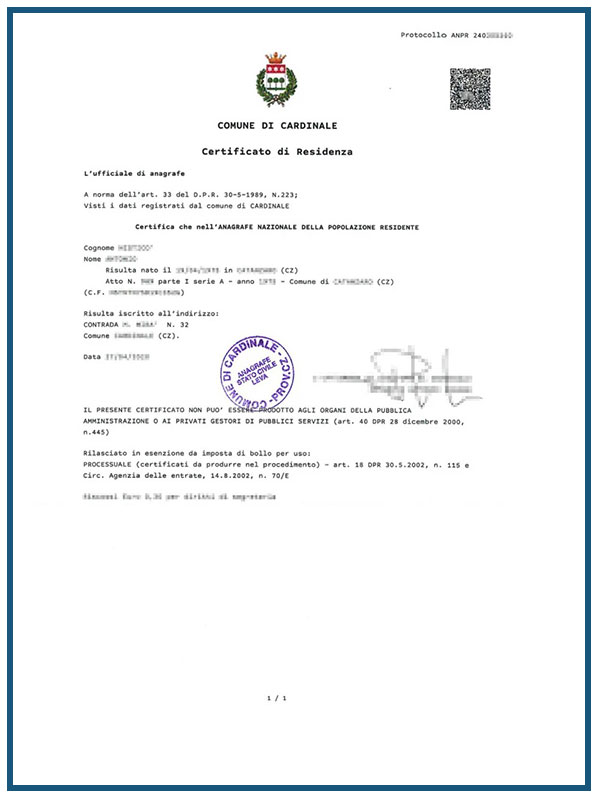 Traduzione ufficiale del certificato di residenza per uso presso ambasciate, consolati, uffici immigrazione, istituti bancari e datori di lavoro esteri. Richiesta per pratiche di visto, permesso di soggiorno, apertura di conti correnti e contratti di locazione all’estero.