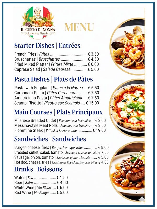 Sei in: Home1 / Shop2 / Traduzione3 / Menu ristorante
