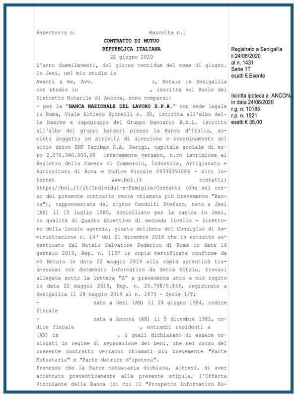 Traduzione giurata del contratto di mutuo ipotecario per uso presso notai esteri, istituti di credito internazionali e autorità giudiziarie straniere. Necessaria per operazioni immobiliari transfrontaliere, rinegoziazioni con istituti esteri e procedimenti legali internazionali, e per atti notarili di compravendita immobiliare con acquirenti o venditori stranieri.
